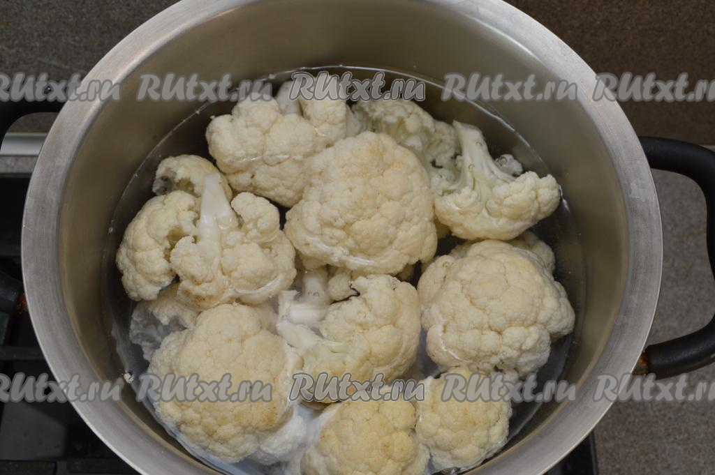 В кастрюлю налить воду комнатной температуры, подсолить её по вкусу и опустить в неё соцветия капусты (добавляя соль, учитывайте, что в дальнейшем солиться капуста больше не будет). Варить капусту 4-5 минут с момента закипания (отваренная капуста должна очень хорошо держать форму, но при этом достаточно легко прокалываться ножом).