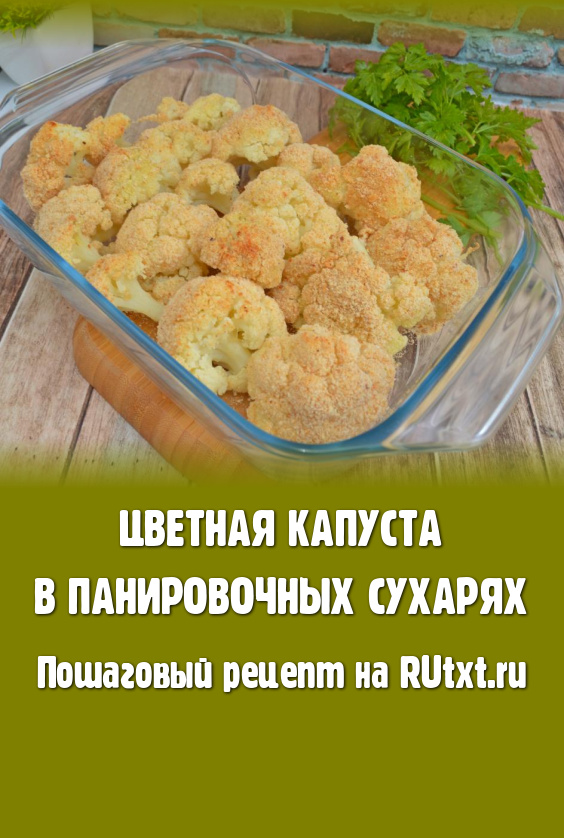 Я часто готовлю цветную капусту по различным рецептам. В этот раз предлагаю запечь в духовке цветную капусту, покрытую панировочными сухарями. Блюдо получается достаточно диетическим, ведь готовится без добавления масла. Капуста вначале отваривается, а затем запекается в сухарях, в результате она получается вкусной, аппетитной, покрытой приятно похрустывающей корочкой. Это блюдо можно подать и в качестве гарнира (например, к курице или мясу), и в качестве основного в дни Поста. Просто, сытно и вкусно, попробуйте!