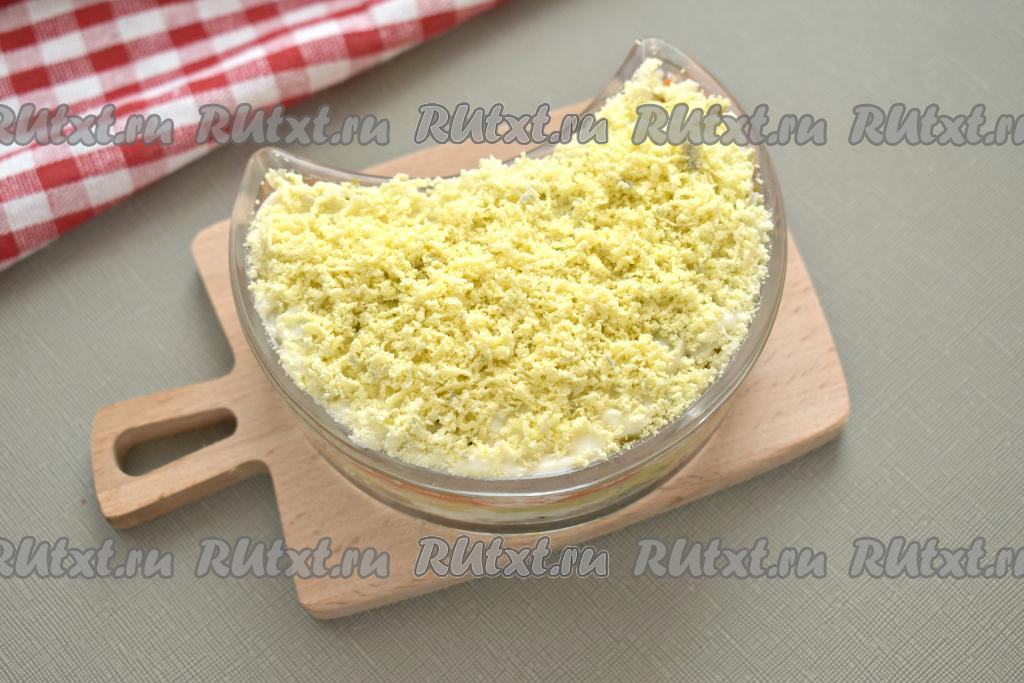 Завершающим слоем салата "Мимоза" по традиции яичные желтки, натёртые на мелкой тёрке.