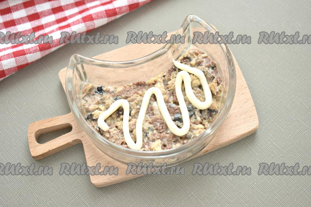 Вторым слоем выкладываем картофель, натёртый на крупной тёрке, немного солим, наносим майонез.