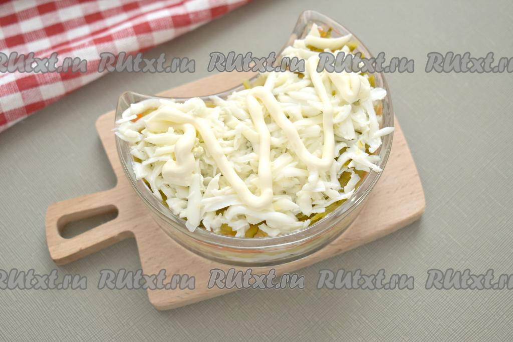 Разделяем варёные яйца на белки и желтки. Поверх огурцов выкладываем белки, натёртые на крупной тёрке, смазываем сверху майонезом.