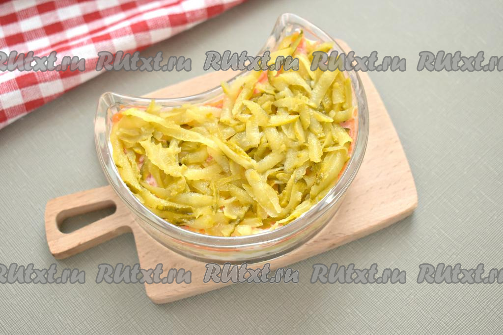 Затем раскладываем солёные огурцы, натёртые на крупной тёрке.