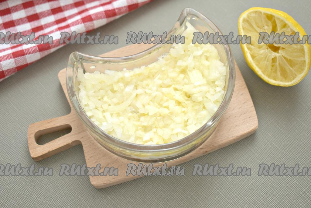 Очищаем лук, мелко нарезаем его, перекладываем в небольшую ёмкость, взбрызгиваем лимонным соком, перемешиваем и оставляем на пару минут. Лук отжимаем и выкладываем в салатник третьим слоем.
