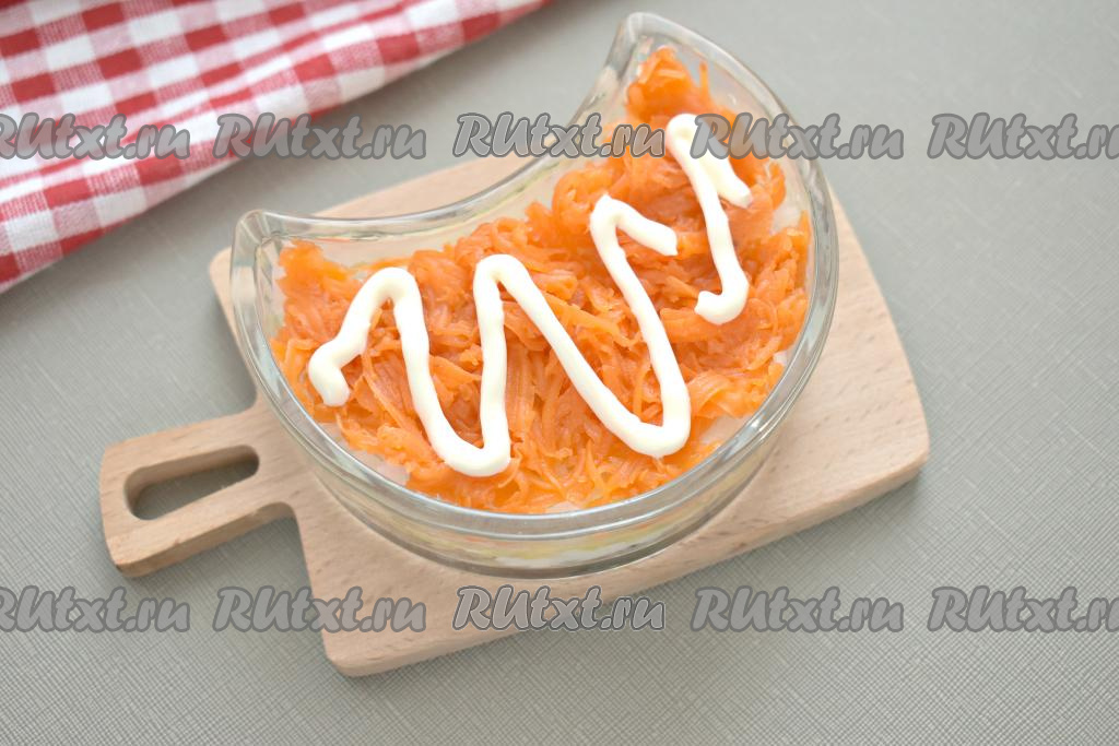 Поверх лука равномерно выкладываем натёртую на крупной тёрке морковку, смазываем майонезом.