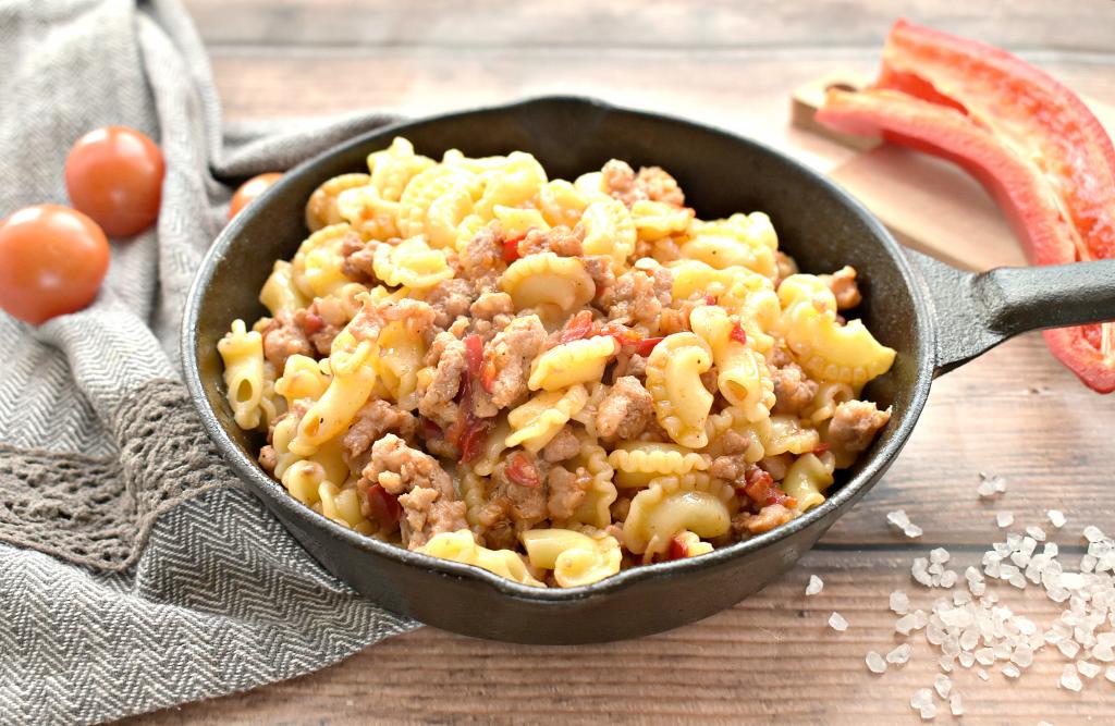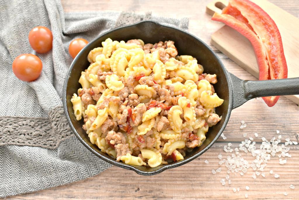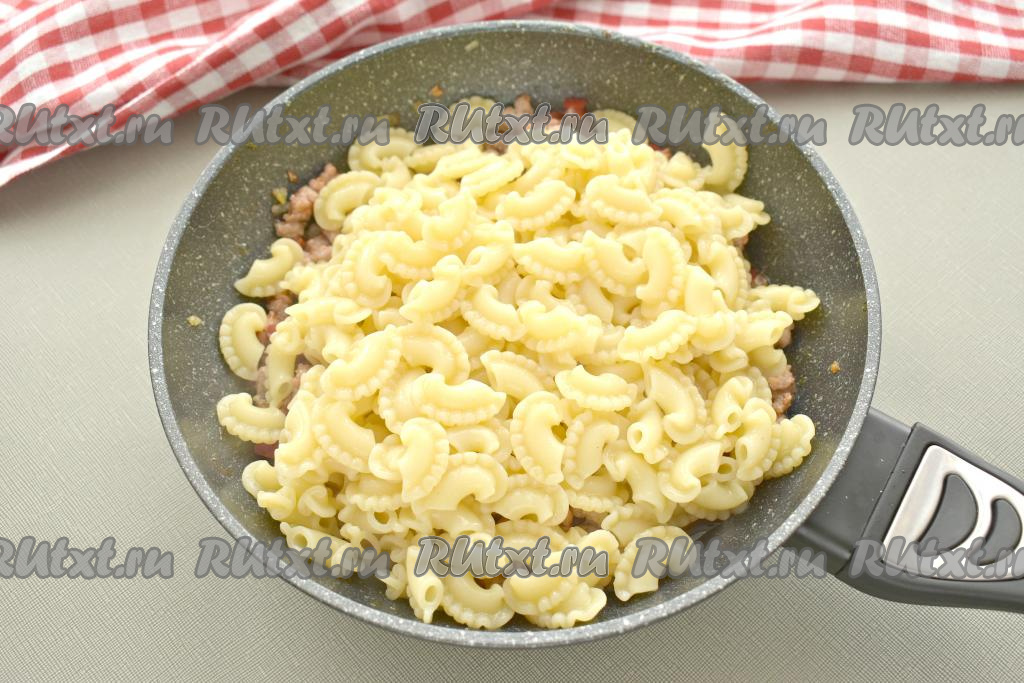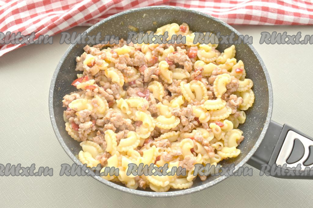 Затем перекладываем макароны на сковороду к фаршу и болгарскому перцу.
