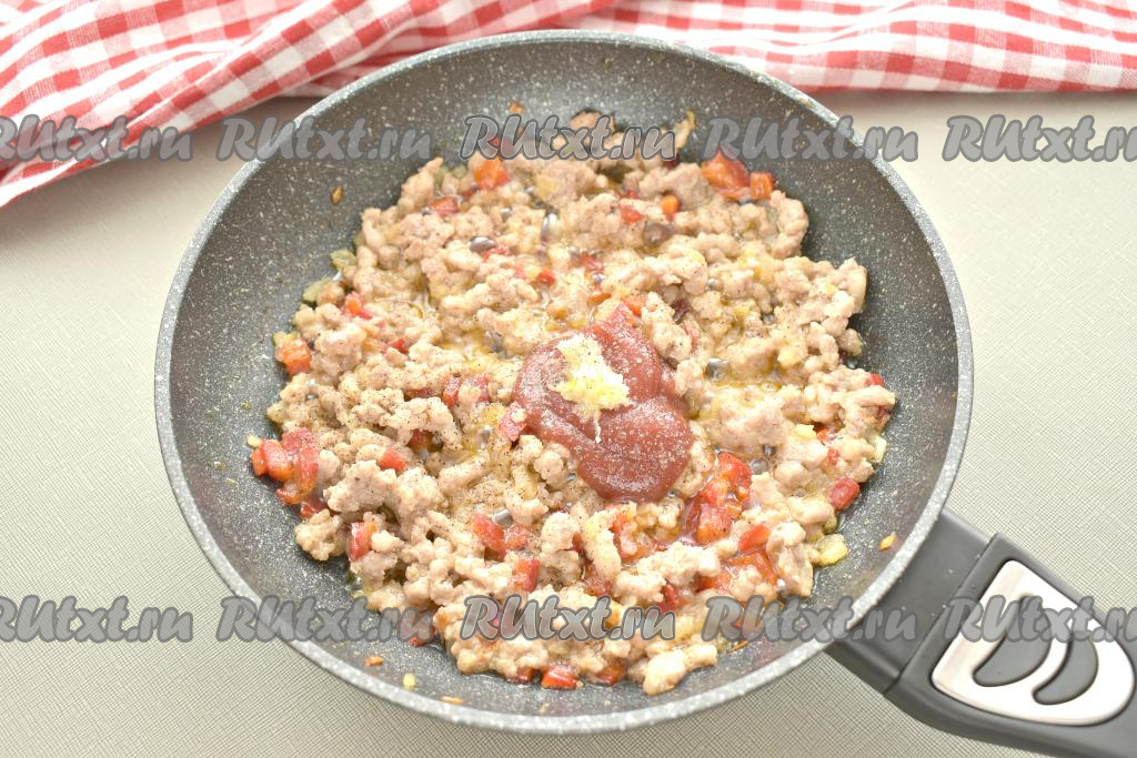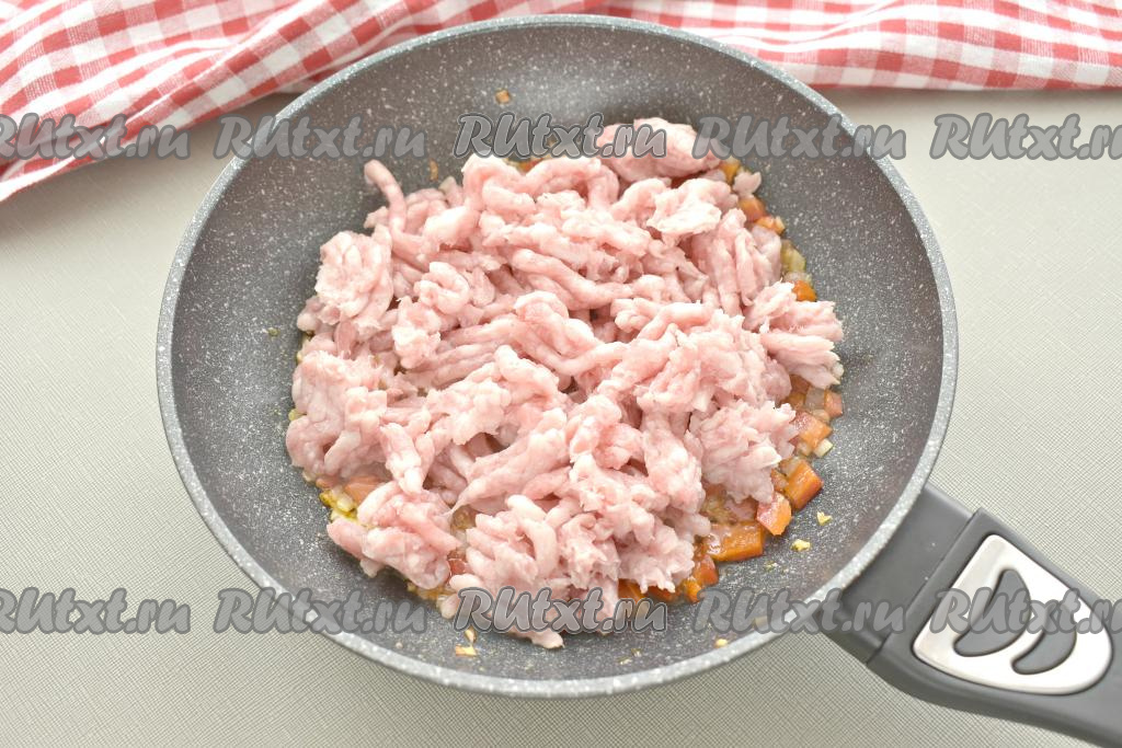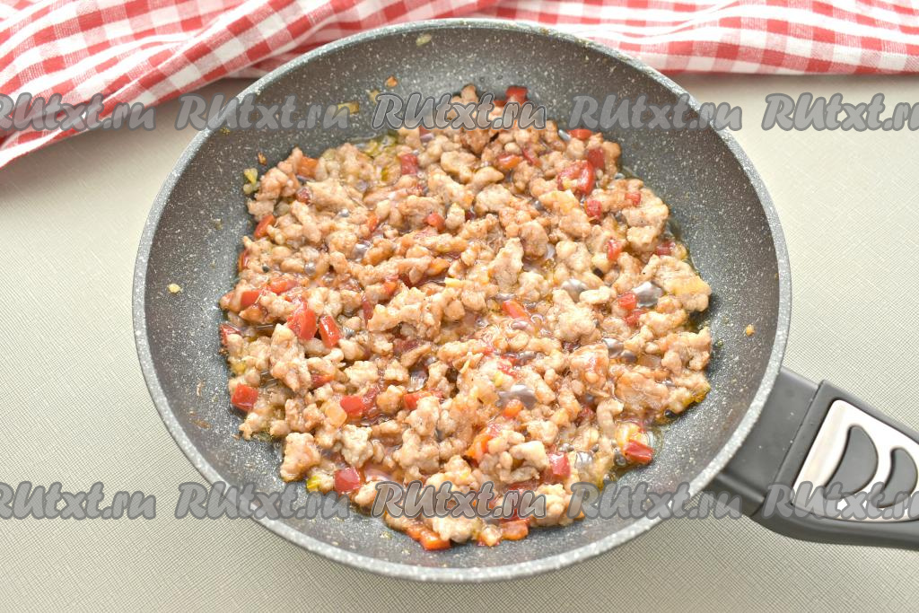 Добавляем в сковороду мясной фарш, перемешиваем. Обжариваем фарш с луком и болгарским перцем 10-12 минут, периодически перемешивая и разбивая комочки фарша лопаточкой.