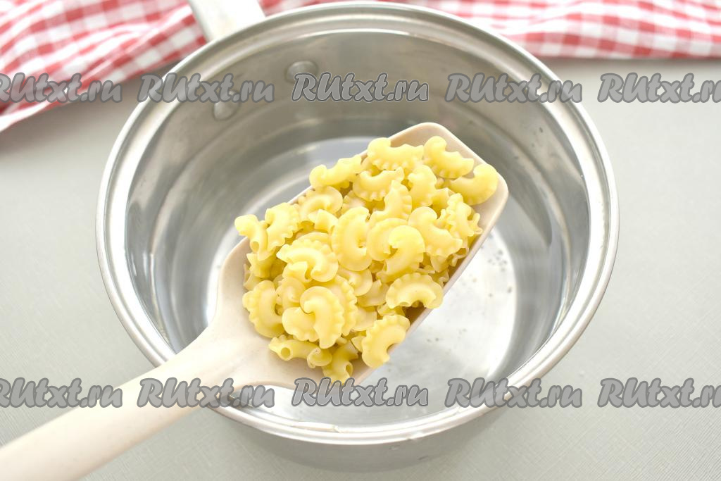 В кастрюлю наливаем нужное количество воды (на варку 250 грамм макарон, как правило, требуется 2,5 литра воды). Воду доводим до кипения, солим, выкладываем макароны, сразу перемешиваем и варим с момента закипания до готовности на небольшом огне (примерно 7-10 минут, но лучше точное время варки посмотреть на упаковке макаронных изделий, которые вы готовите). Когда макароны будут готовы, откидываем их на дуршлаг, чтобы слить воду.