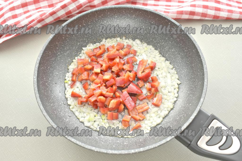 Очищаем болгарский перец от семян и плодоножки, после этого промываем его и нарезаем на маленькие кубики, отправляем к луку на сковороду, обжариваем 3-4 минуты. Не забывая иногда перемешивать овощи.