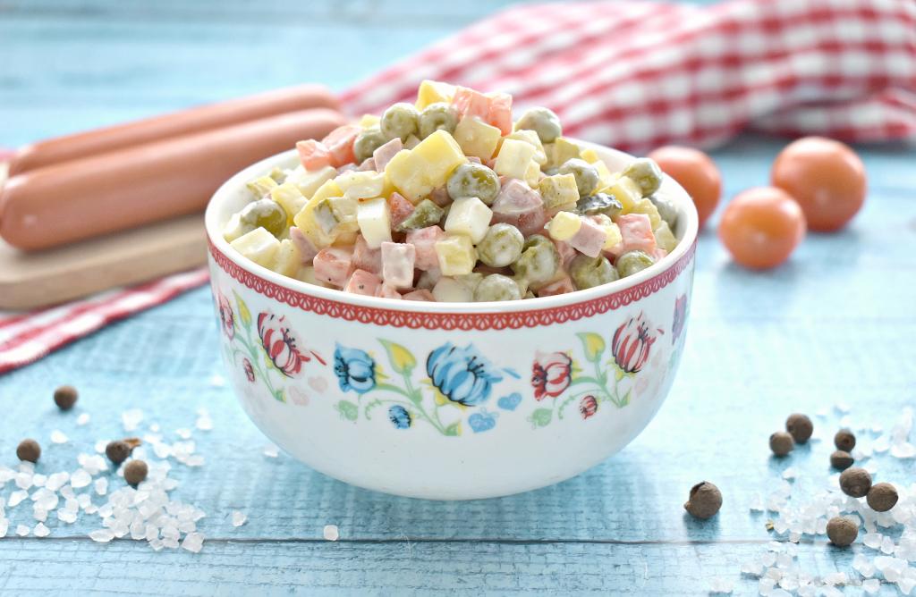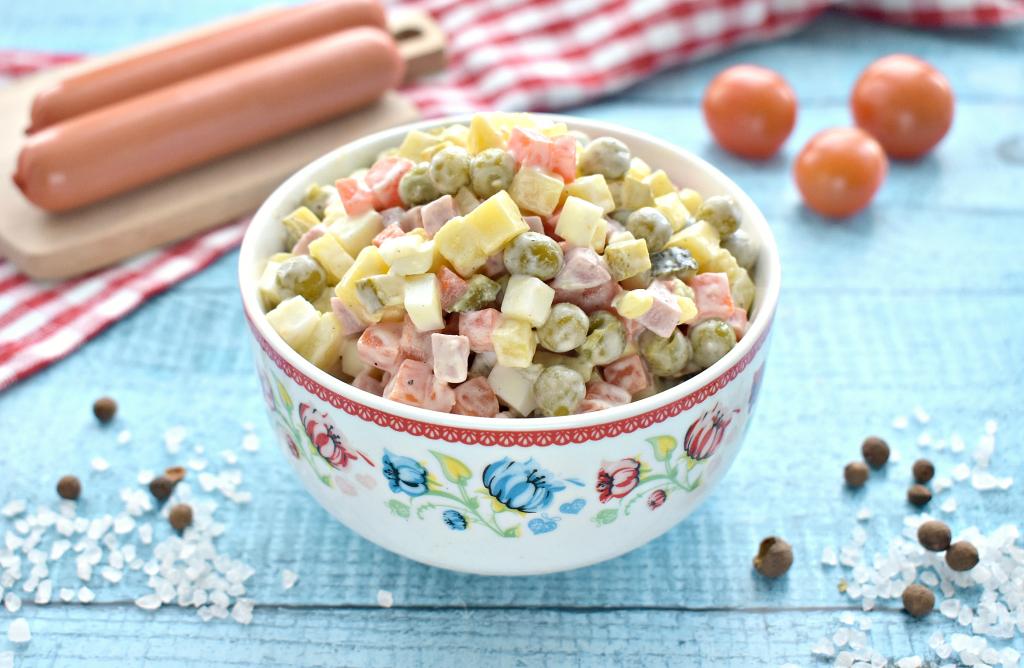 Вкусный, сытный, аппетитный салат "Оливье", приготовленный с сосисками, подаём к столу.