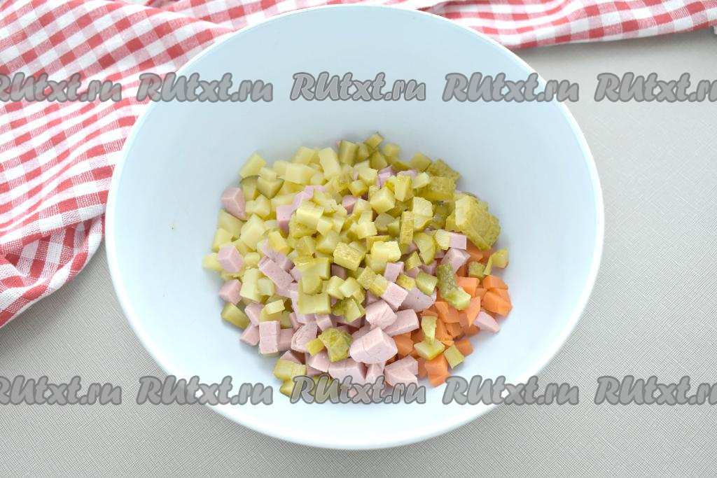 На кубики такого же размера нарезаем огурец. Складываем огурцы и сосиски в миску с морковкой и картофелем.