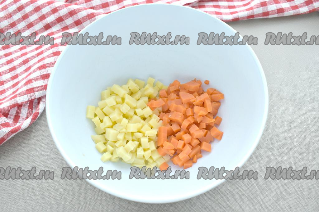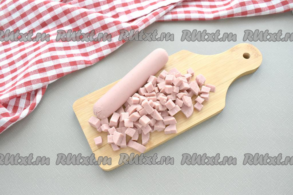 Сосиски используем качественные, с любимым вкусом. Нарезаем сосиски, очищенные от слюды, на кубики примерно такого же размера, как нарезали картошку и морковь.