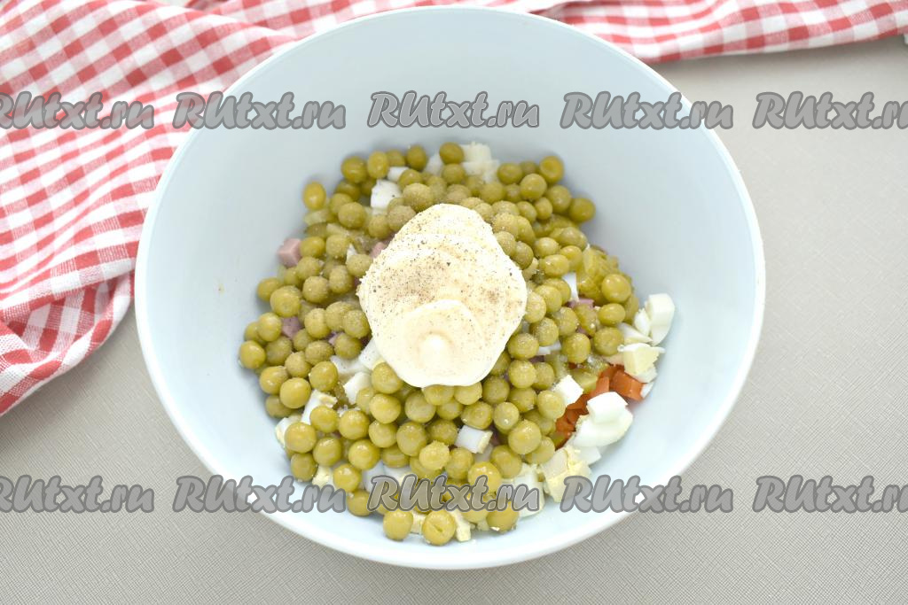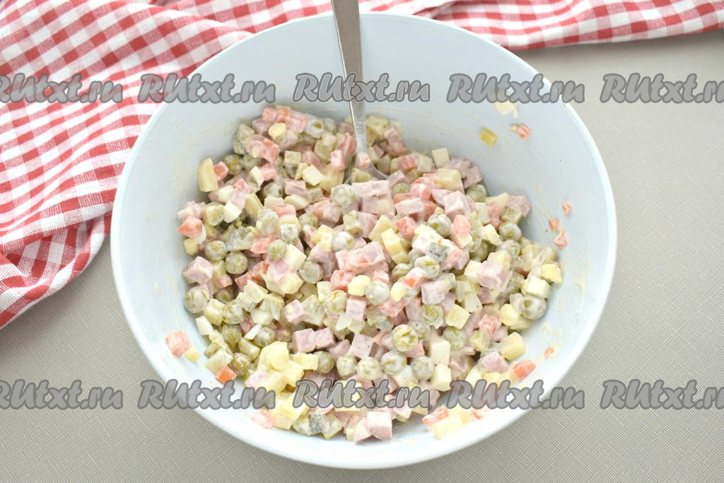 По вкусу салат "Оливье" солим и перчим. Майонезом заправляем непосредственно перед подачей на стол.
