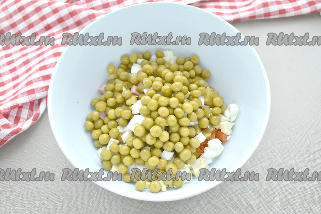 Зелёный консервированный горошек из банки выкладываем сначала на дуршлаг или сито. Когда жидкость с горошка уйдёт, добавляем его в миску.