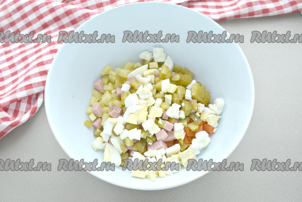 Яйца тоже нарезаем на небольшие кубики и сразу же добавляем в миску с сосисками и овощами.