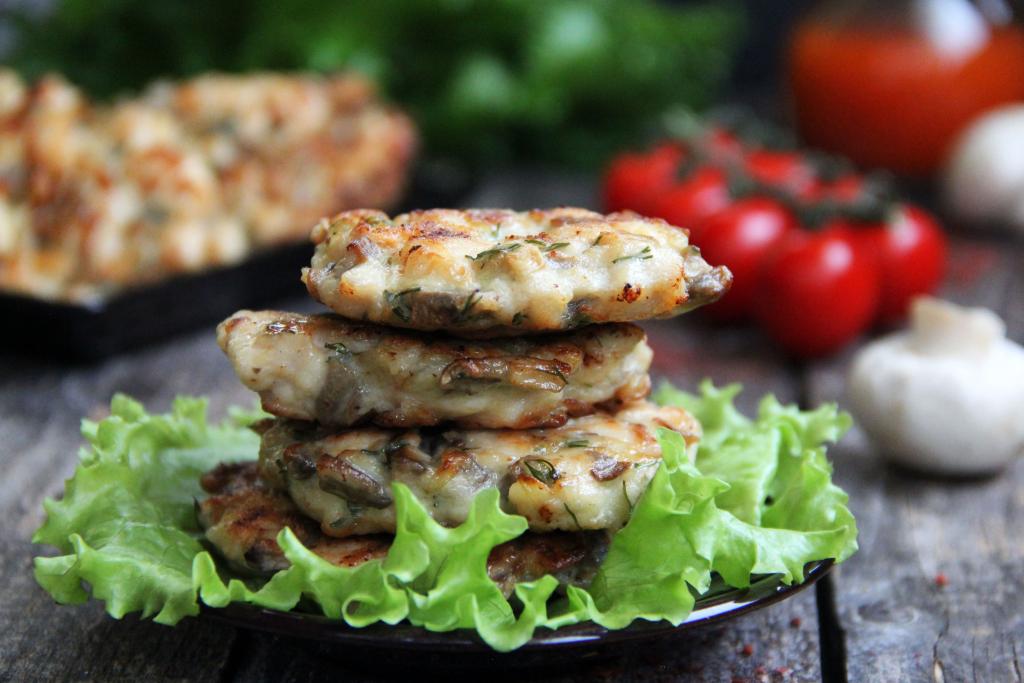 Готовые куриные котлеты с грибами переложить на тарелку. Постепенно пожарить все котлетки. Вкусные, ароматные рубленные котлеты подать к столу горячими, дополнив гарниром. А после остывания такие котлетки хороши на кусочке чёрного хлебушка.