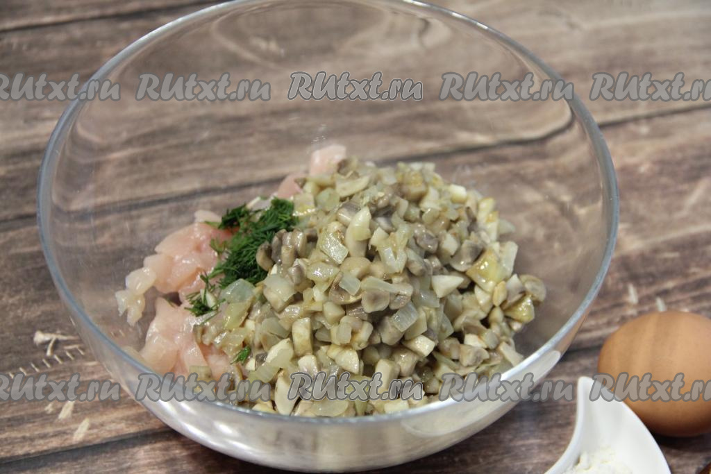 К куриному мясу и зелени добавить остывшие грибы с луком.