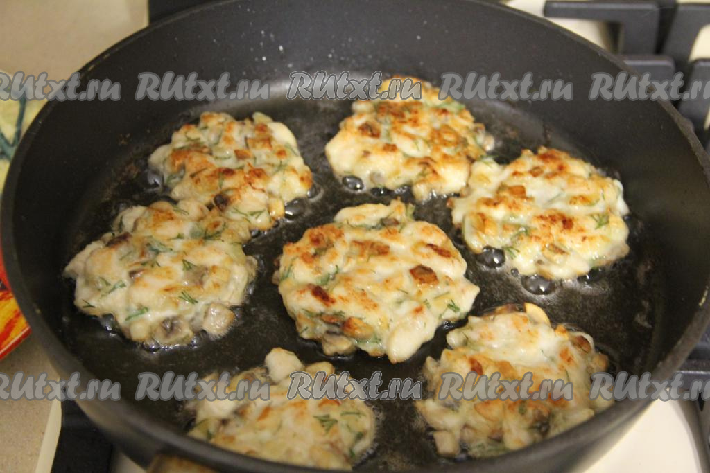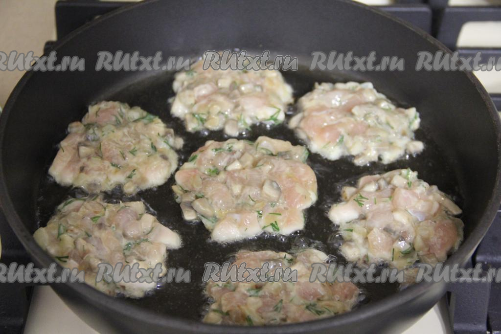 В сковороду влить масло и разогреть. Выкладывать в разогретое масло по 1 столовой ложке курино-грибной массы, формируя круглые рубленные котлетки.