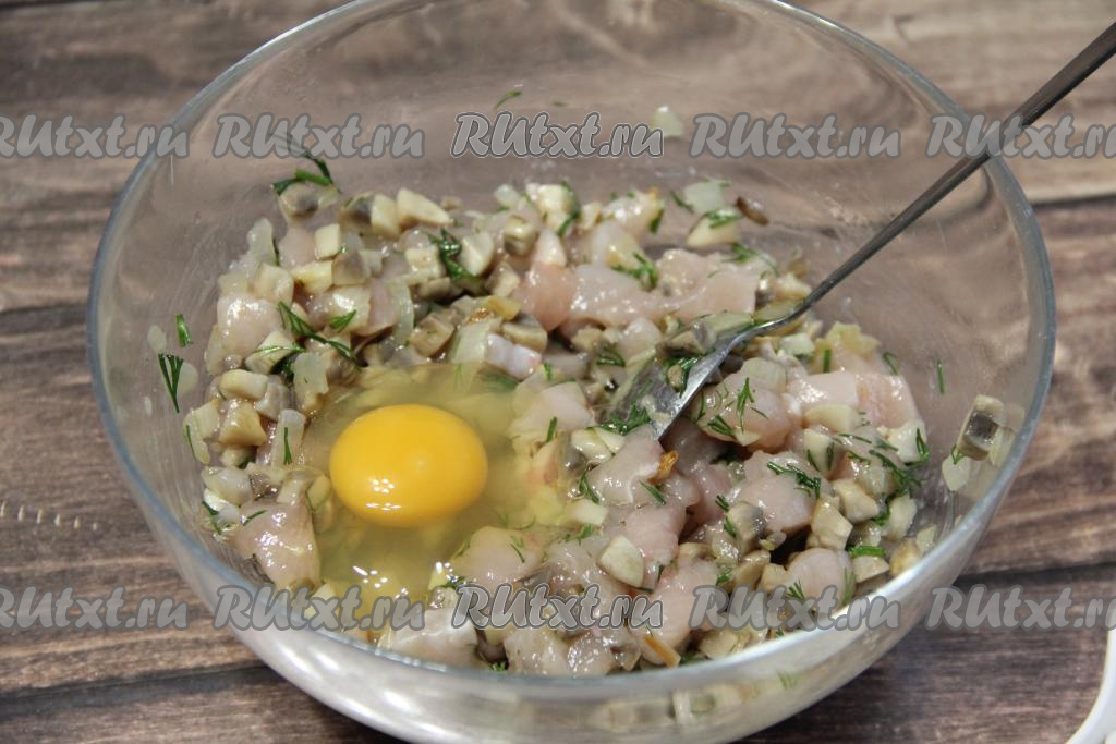 Перемешать курино-грибную массу ложкой. Добавить яйцо.