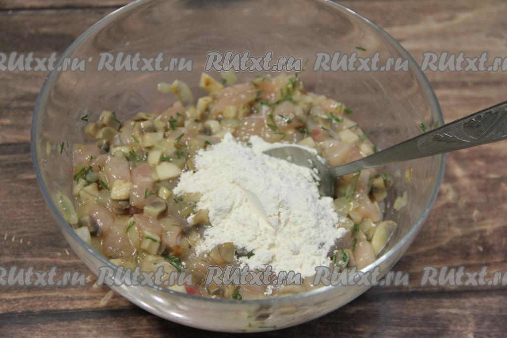 Всыпать муку и хорошо перемешать. Курино-грибная масса получится вязкой.