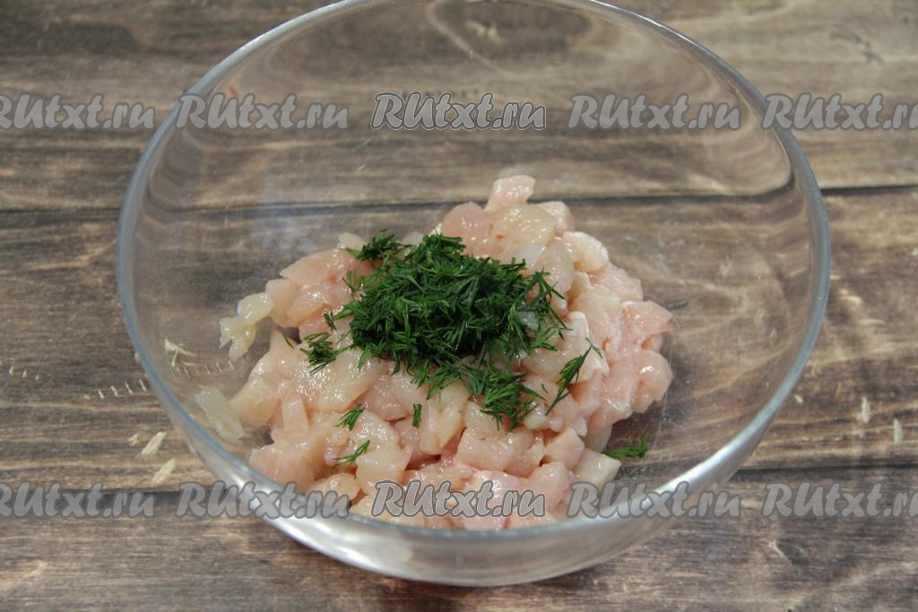Куриное филе нарезать ножом на мелкие кусочки, переложить в миску, добавить мелко рубленную зелень.