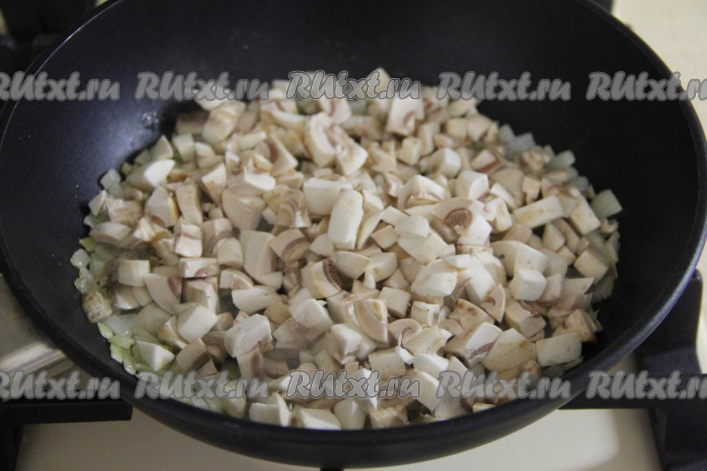 Шампиньоны (или отваренные лесные грибы) нарезать на мелкие кубики и добавить в сковороду к луку.