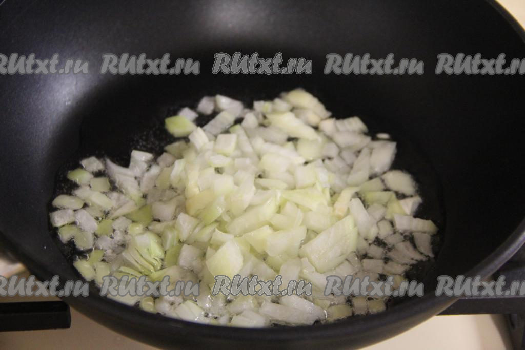 Очистить половину луковицы, мелко нарезать и переложить в сковороду, прогретую с растительным маслом. Обжарить лук в течение 2-3 минут, помешивая, на среднем огне.