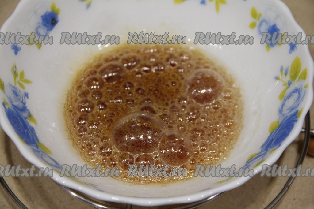 Поставить миску в микроволновку и готовить карамель на максимальной мощности 5 минут. Аккуратно достать миску с карамелью. Карамель будет красивого янтарного цвета. Оставить карамель на пару секунд, чтобы осели пузыри.