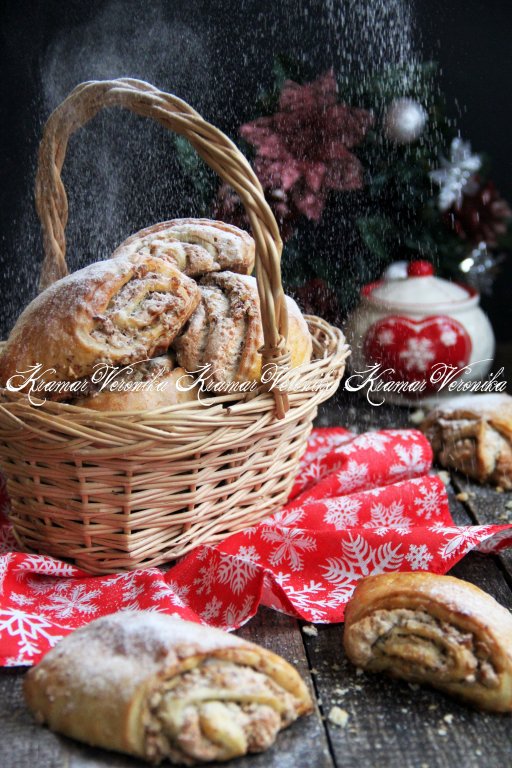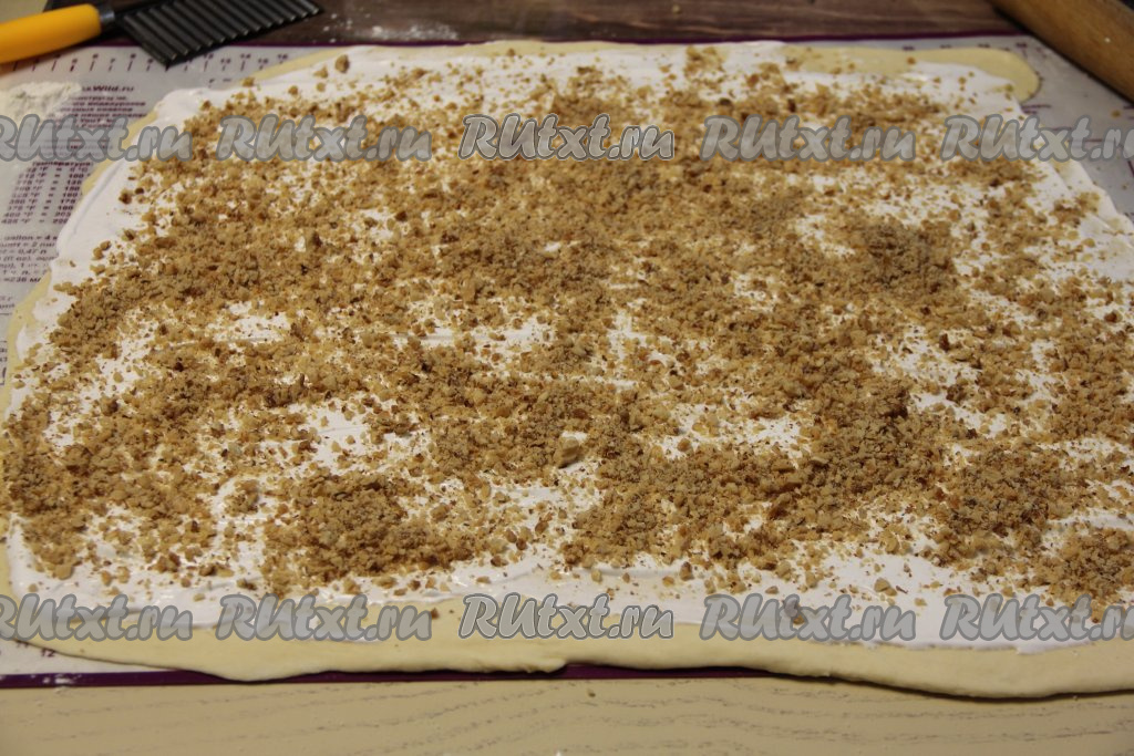 Свернуть тесто с начинкой в плотный рулет. Я свернула тесто, начиная с двух широких сторон к центру, и получилось два рулета. Не делайте рулет толстым, он плохо пропечётся!