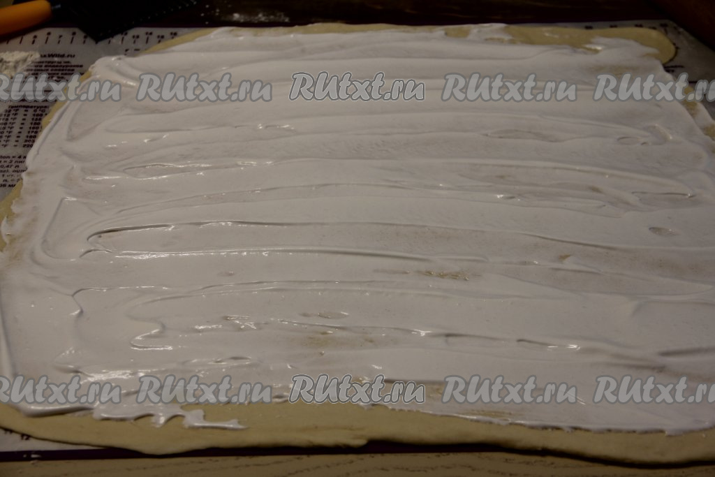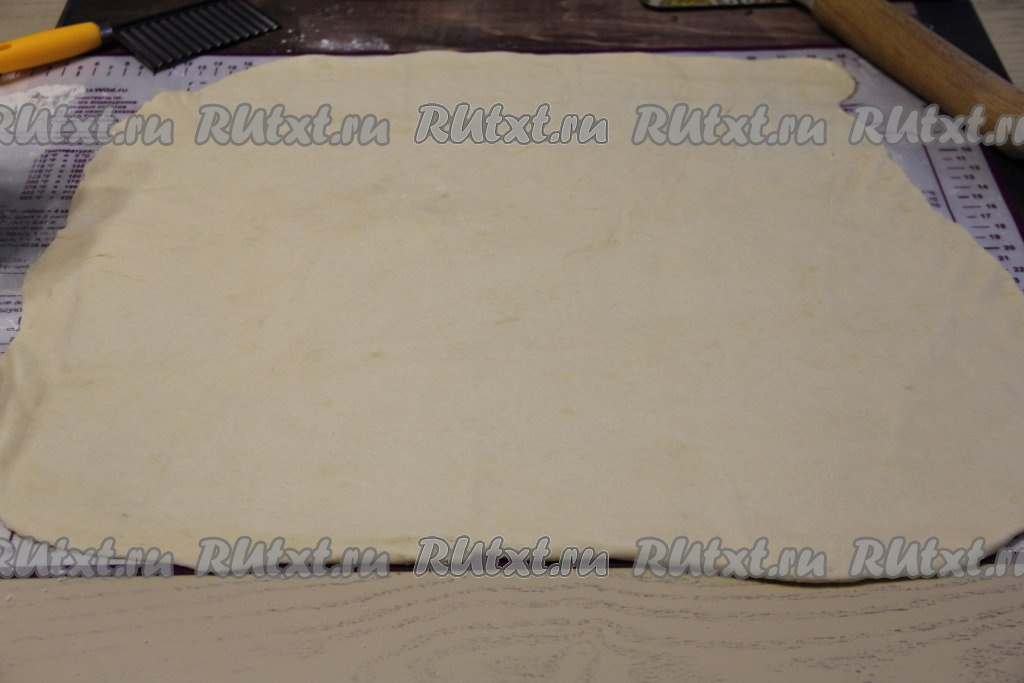 Рабочую поверхность слегка припылить мукой, выложить тесто и раскатать его скалкой в тонкий пласт.
