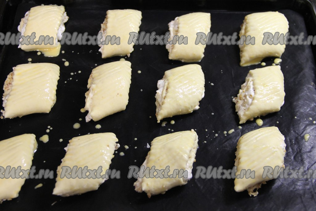 Переложить заготовки печенья на противень, застеленный ковриком для выпечки (или пергаментной бумагой). Верх печенюшек смазать взбитым желтком.
