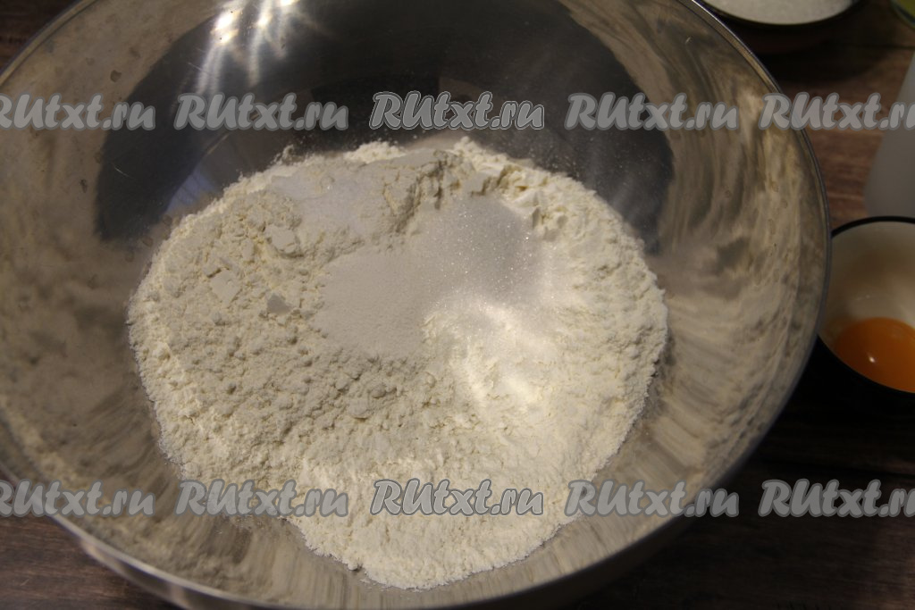 Прежде всего замесим песочное тесто, для этого нужно в объёмную миску всыпать муку, сахар, разрыхлитель, соль, перемешать.