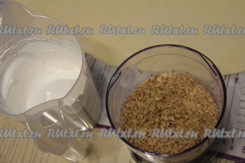 Для приготовления начинки прежде всего нужно охлаждённые яичные белки взбить миксером, постепенно добавляя сахар. Взбивать нужно до стойких пиков и полного растворения сахара. Орехи измельчить в крошку.