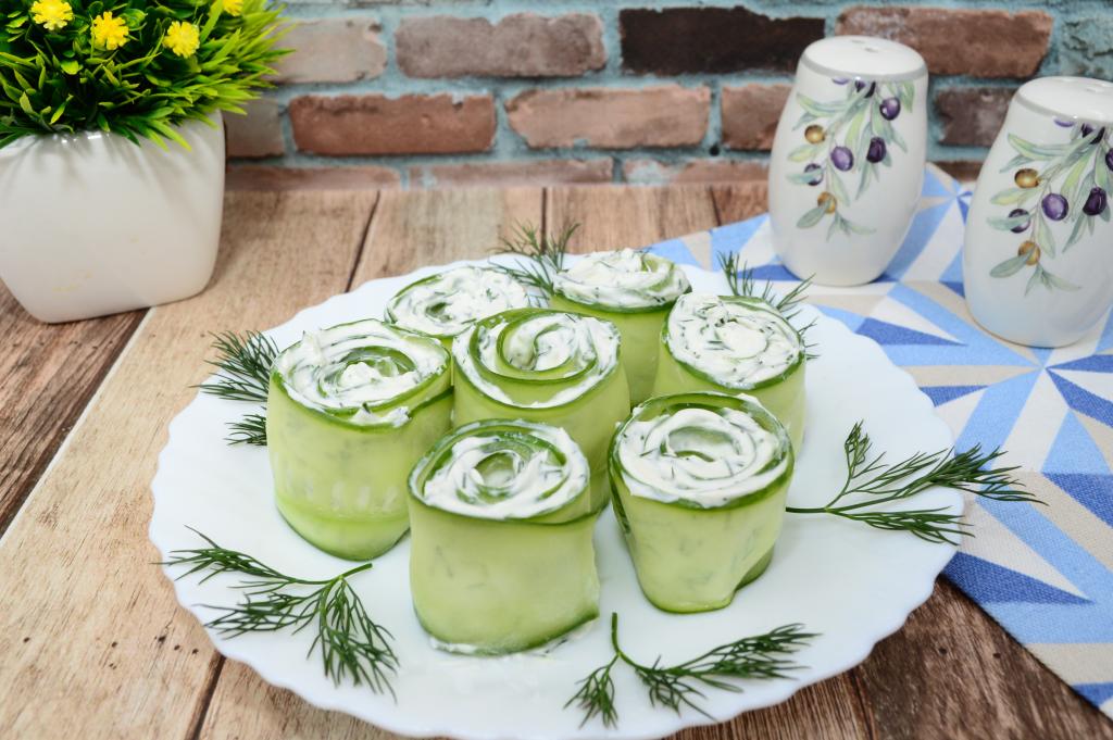 Рулетики из огурца с творожным сыром убрать в холодильник на 1-2 часа, чтобы они как следует пропитались, тогда они будут лучше держать форму. Скреплять их шпажками или зубочистками не нужно, закуска после охлаждения и пропитки отлично держит форму и не разваливается. При подаче украсить рулетики веточками зелени. Эта простая и вкусная закуска отлично смотрится на столе и в будни, и в праздники. А поскольку в таких рулетах нет майонеза и масла, едят их с удовольствием все без исключения!