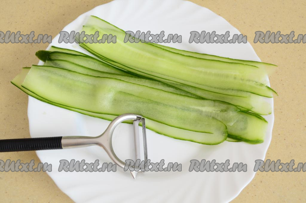 С помощью овощечистки нарезать огурец на тонкие полоски (слайсы). Я срезала полоски с двух сторон огурца, у меня получилось 14 полос (из которых я затем скрутила 7 рулетиков). Середину огурца, где особенно много семечек, я для формирования рулетов не использую.