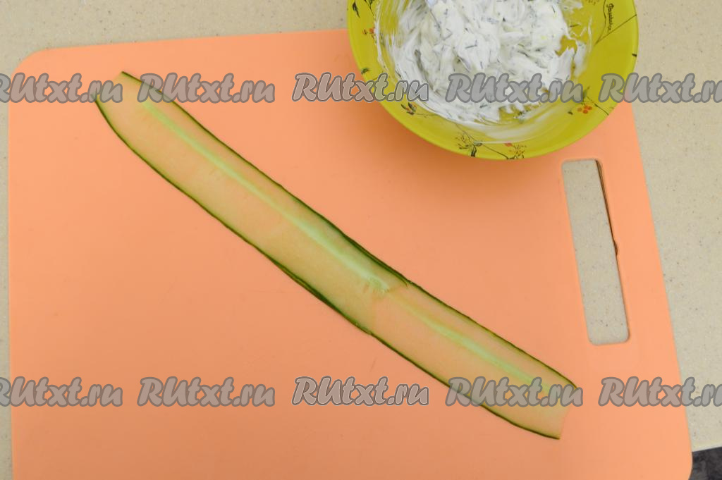 На разделочную доску выложить внахлёст две полоски огурца.