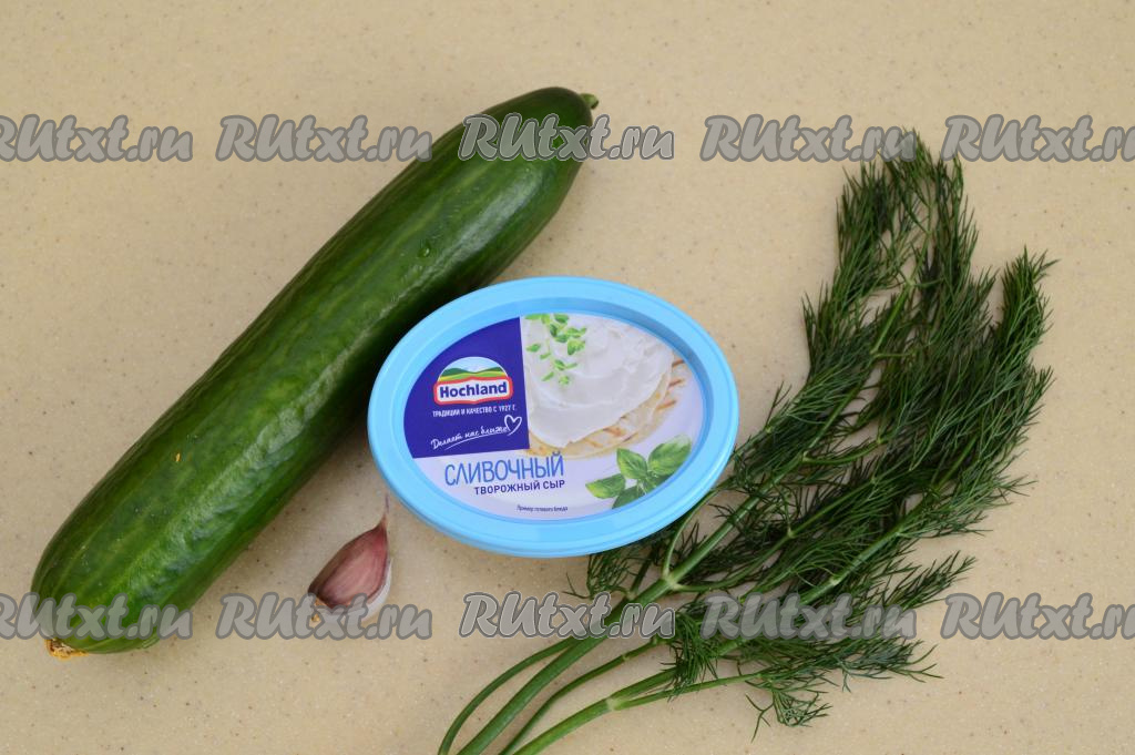 Подготовить продукты. Огурец нужно выбирать длинный и достаточно плотный, не толстый, в нём не должно быть крупных семечек. Творожный сыр я брала без добавок. В качестве зелени можно взять укроп, петрушку, кинзу или базилик - кому что нравится. Зелень вымыть и немного обсушить.
