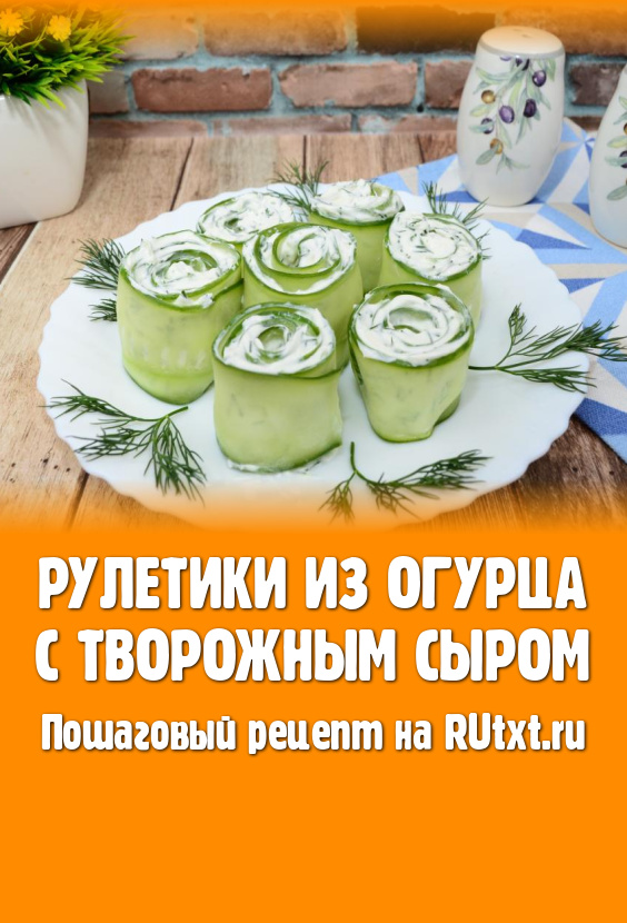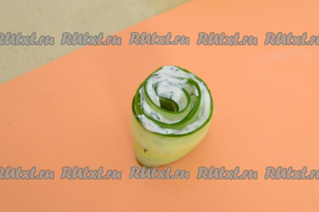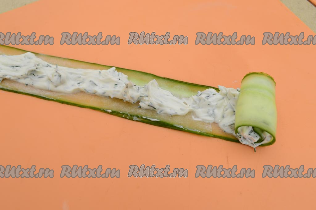 На получившуюся полоску из огурца нанести часть начинки из творожного сыра и зелени. С одного края оставить 2-3 сантиметра огурца чистым (без начинки). Скрутить полоску из огурца в плотный рулет, начиная с края с начинкой.