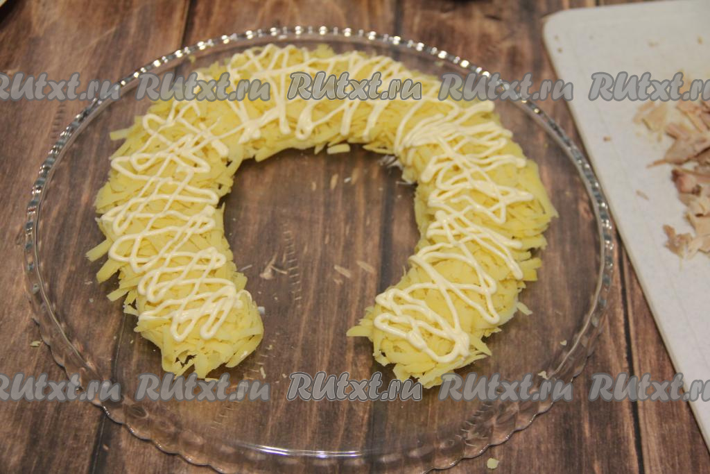 Затем нанести сеточку из майонеза и покрыть салат "Подкова" сверху и по бокам натёртым на мелкой тёрке сыром.