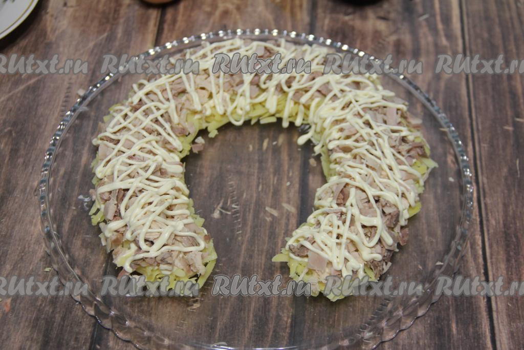 Оливки нарезать на кружочки и выложить на подкову. Этот красивый, очень вкусный и нежный салат станет украшением любого торжества!