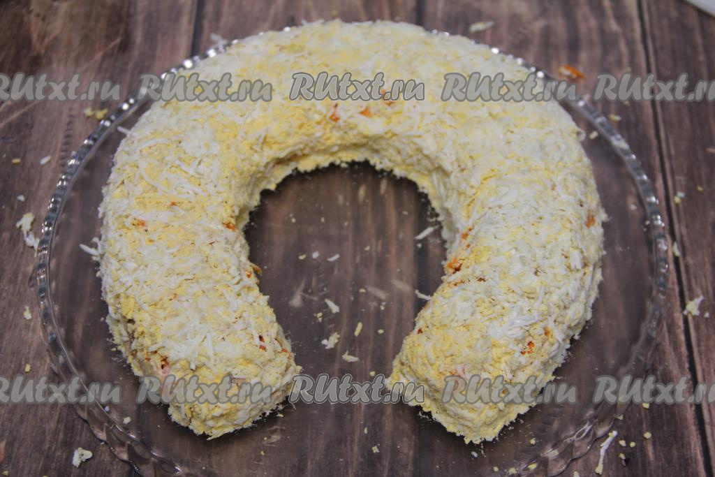 Поверх морковки выложить натёртые на крупной тёрке яйца. Утрамбовать слои и выровнять форму подковы.