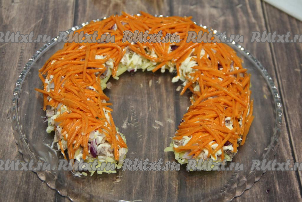 Поверх лука равномерно разложить корейскую морковь, слегка смазать майонезом.