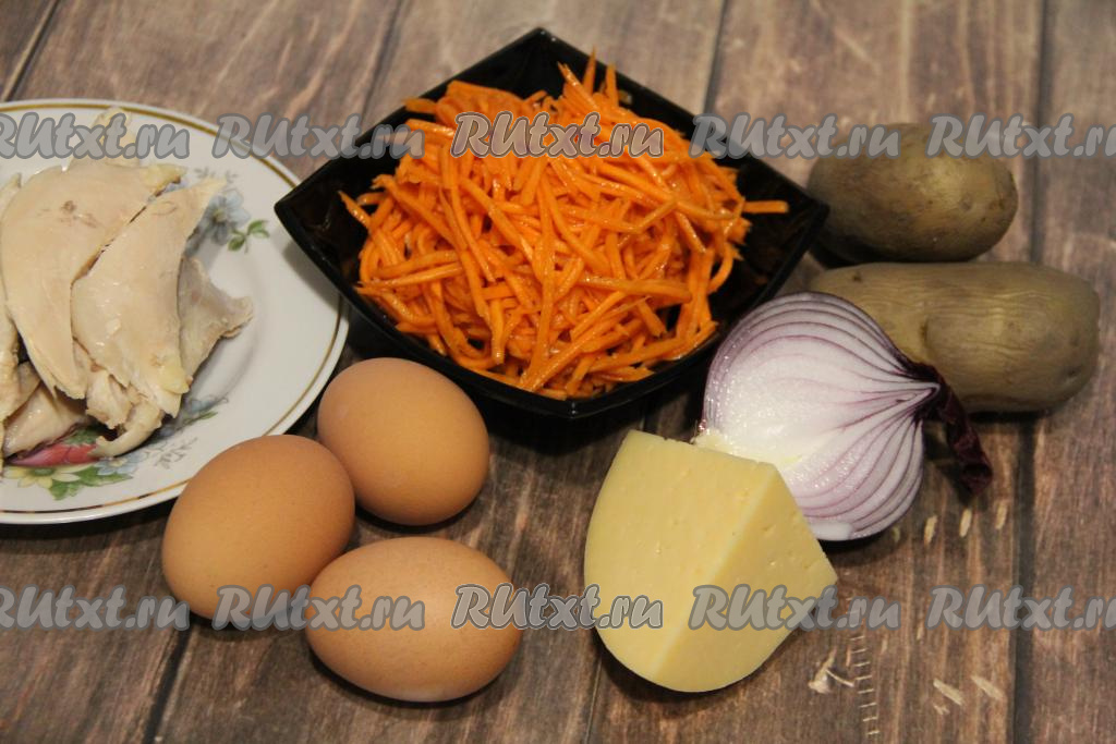 Подготовить продукты. Сварить вкрутую яйца (варить минут 9-10 с момента закипания), остудить их и очистить. Картошку отварить в кожуре до готовности (в течение минут 20-25 после закипания воды), остудить. Корейскую морковку можно использовать покупную, можно приготовить морковь по-корейски самостоятельно. Для этого салата можно взять куриное филе, отваренное в подсоленной воде (в течение 25-30 минут после закипания воды), можно использовать копчёную курицу.