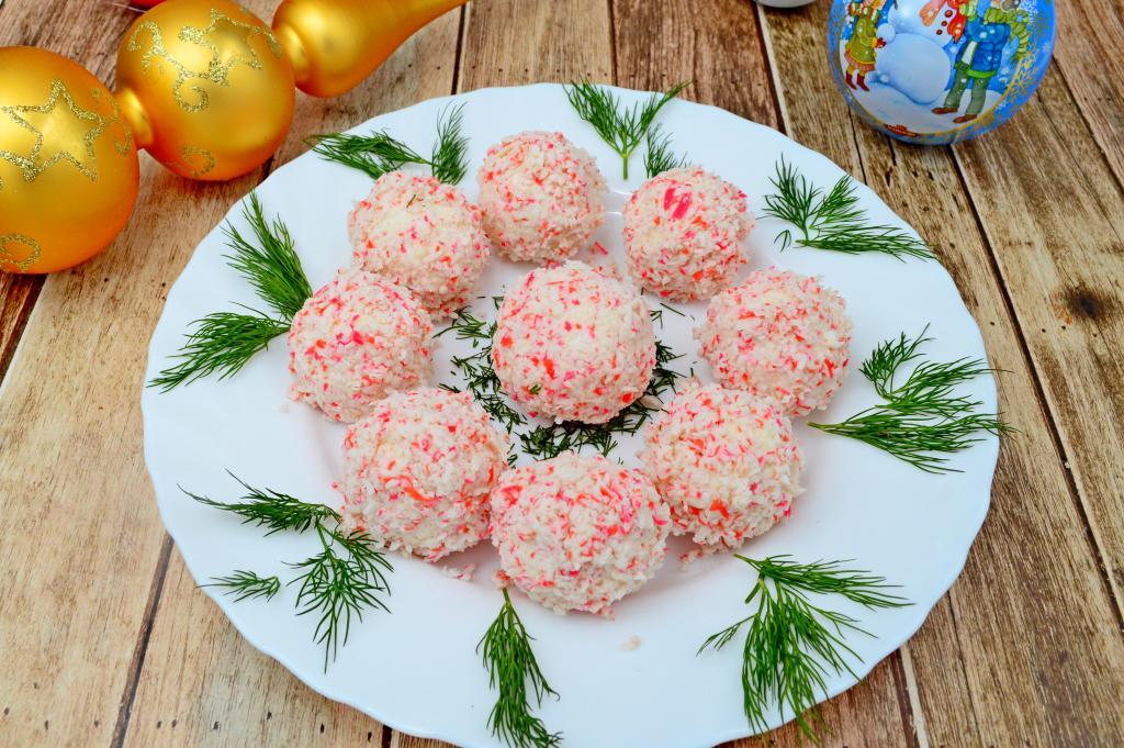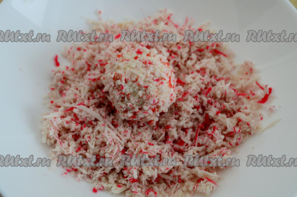 Каждый шарик обвалять со всех сторон в заранее отложенных натёртых крабовых палочках. Отправить в холодильник на 1 час, чтобы закуска стабилизировалась.