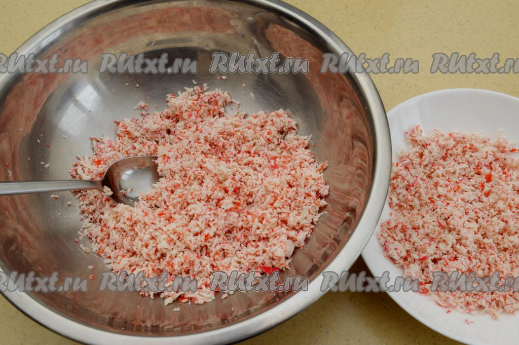 Натереть слегка подмороженные крабовые палочки на мелкой тёрке в глубокую миску. Треть натёртых палочек отложить в отдельную тарелку, они нам понадобятся в конце для обсыпки наших рафаэлок.