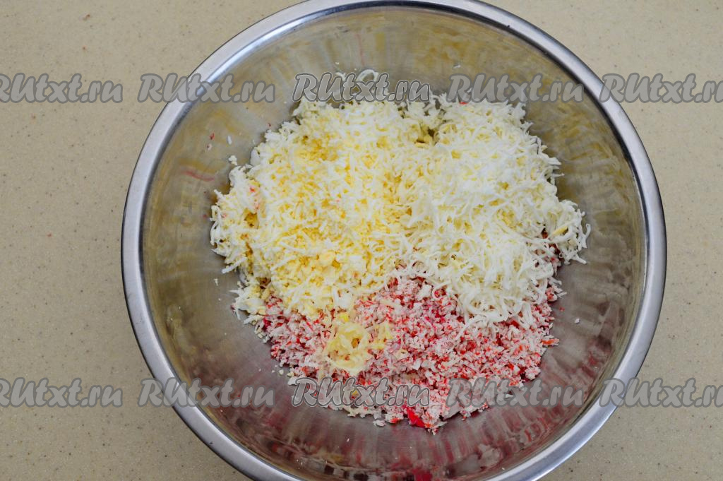 В миску с большей частью крабовых палочек добавить натёртые на мелкой тёрке плавленный сыр, яйца и чеснок.