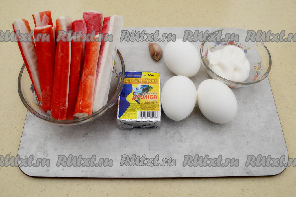 Подготовить продукты. Заранее сварить куриные яйца вкрутую (варить после закипания воды минут 9-10), остудить их и очистить. Слегка разморозить крабовые палочки при комнатной температуре. Крабовые палочки нужно будет в дальнейшем натирать на тёрке, слегка подмороженные палочки натирать немного проще. Хотя и полностью размороженные крабовые палочки натираются достаточно легко. Я обычно эту закуску делаю с плавленным сырком, но можно готовить и с твёрдым сыром.