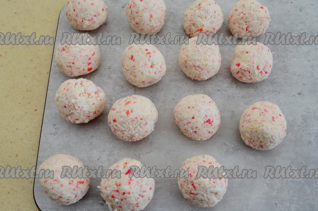 Влажными руками из крабовой массы сформировать шарики размером с достаточно крупный грецкий орех. Всего у меня получилось 15 крабово-сырных шариков.
