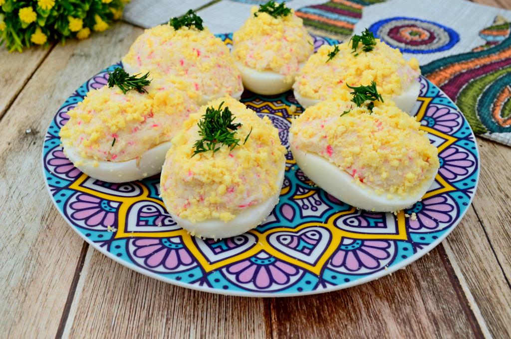 К повседневному и праздничному столу мы достаточно часто подаём фаршированные яйца. И неизменно эта закуска съедается достаточно быстро. Ведь каждый раз в качестве начинки мы используем особенно полюбившиеся нам салаты и паштеты. В этот раз предлагаю наполнить половинки яиц яркой, достаточно сочной начинкой из крабовых палочек, яичных желтков и сыра. Закуска готовится и просто, и быстро, а получается нежнейшей, вкусной, аппетитной и сытной. Она неизменно пользуется популярностью на праздничном застолье!