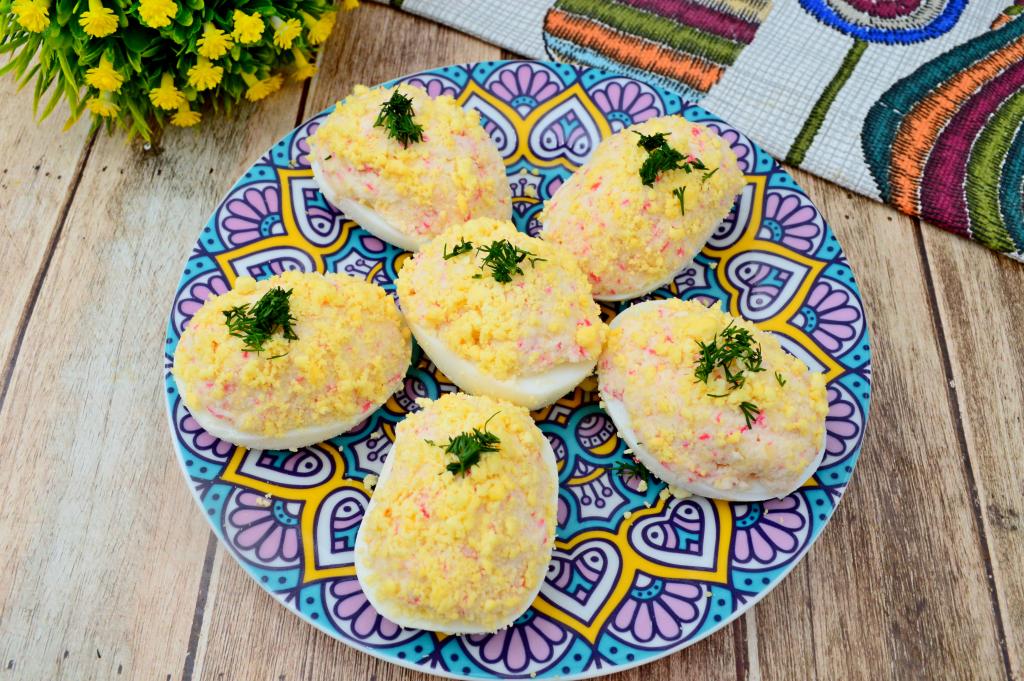 Яйца, фаршированные нежной начинкой из сыра и крабовых палочек, выкладываем на блюдо, по желанию, украшаем мелко нарезанным укропом. Эта вкусная, аппетитная закуска станет украшением и повседневного, и праздничного стола.