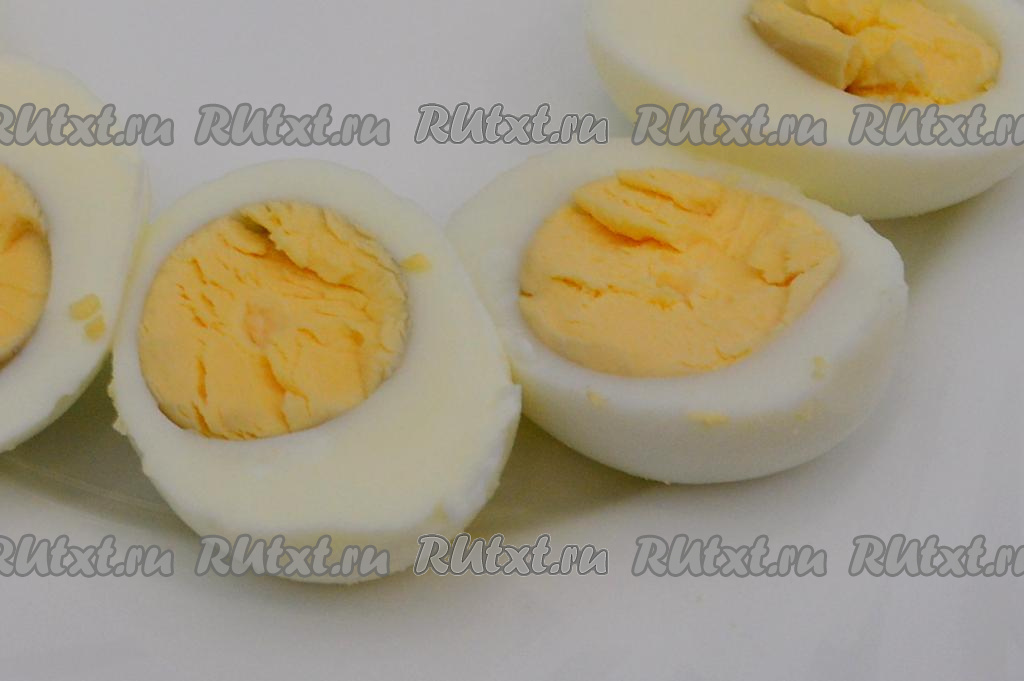 Яйца разрезать вдоль на две части, из каждой половинки достать желток. Желтки переложить в небольшую ёмкость и размять вилкой до однородности. Примерно 1/4 крошки из желтков отложить в сторону (эти желтки нам понадобятся в дальнейшем для украшения).